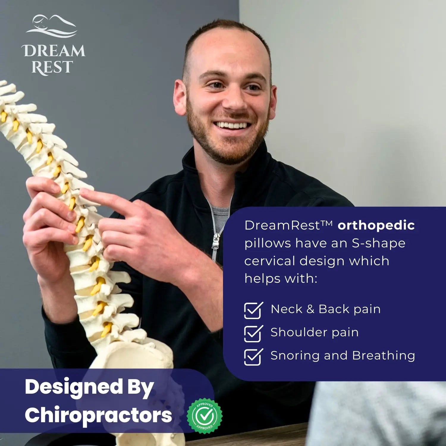 Discover how the DreamRest™ Orthopedic Pillow promotes easier breathing and relieves nightly stiffness for deeper, more comfortable sleep. Its ergonomic contour supports natural neck and spine alig...